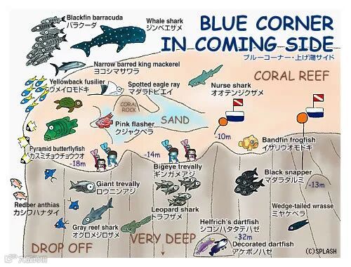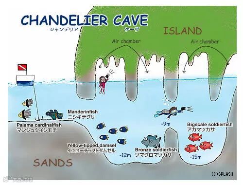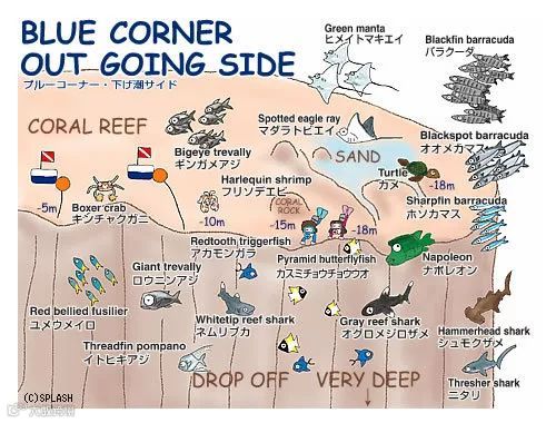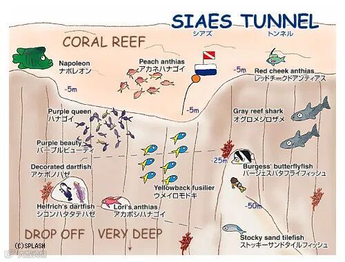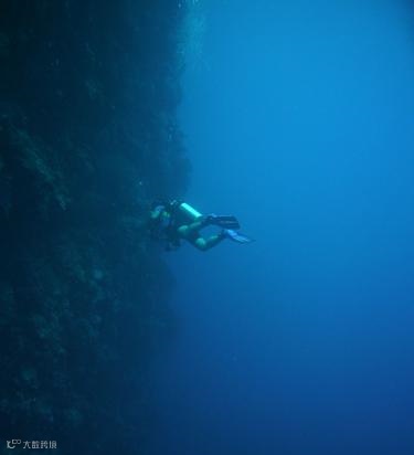 准确的说是由洞穴/峭壁/隧道三部分构成,隧道有三个通向珊瑚峭壁的出口,到达出口前是大洞穴,通道深度从30米到45米,做放流时可以看到鲨鱼、Jack Fish等顶流游出。角的位置存在强流,俯瞰犹如蓝色深渊。