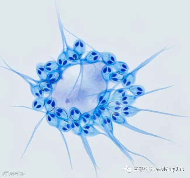 寄生虫H. salminicola的孢虫在显微镜下游动。这些外来的“眼睛”实际上是毒刺细胞,是这种生物没有进化掉的为数不多的特征之一。
