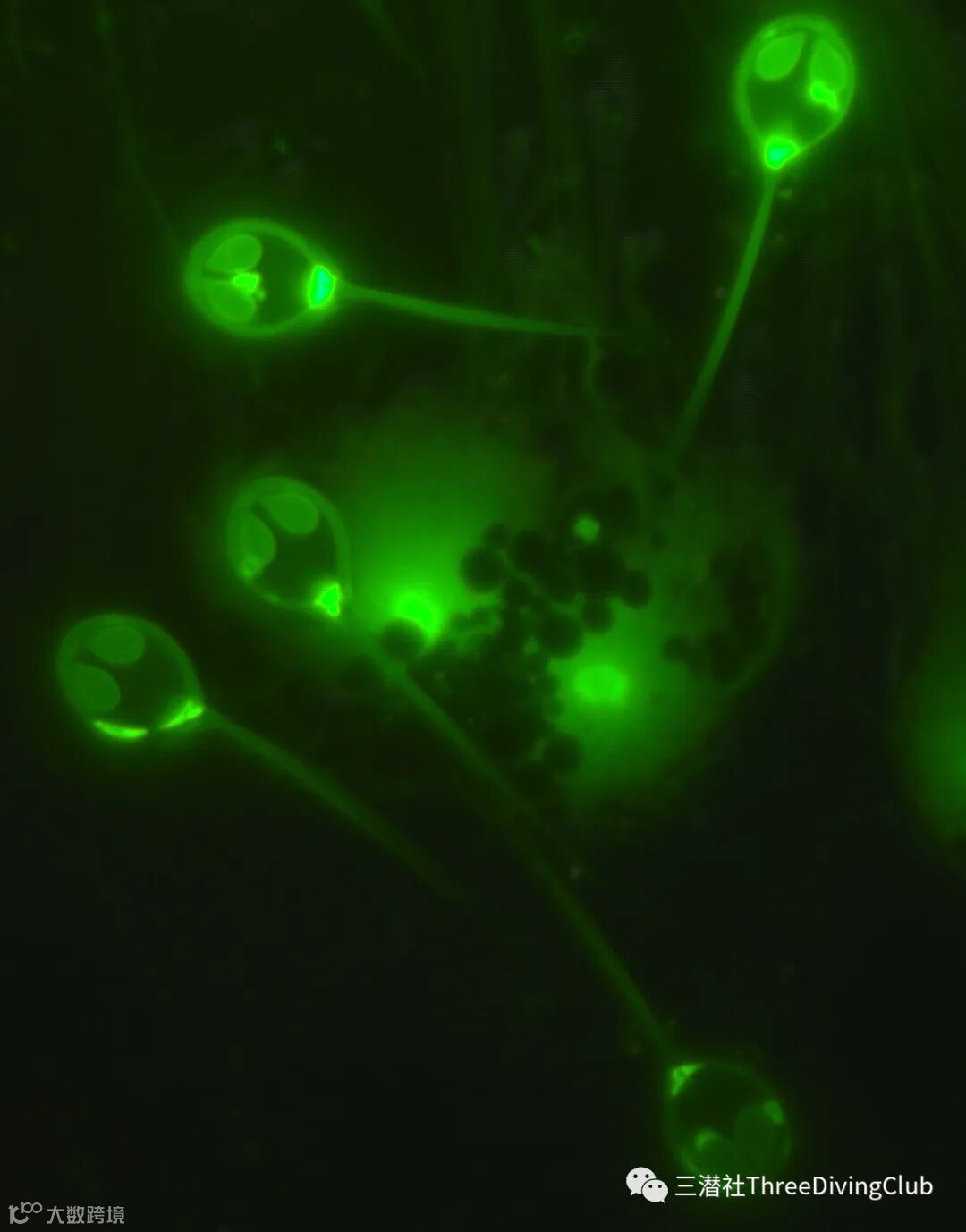 H. salminicola孢虫在荧光显微镜下发光。在荧光显微镜下,每个小沙棘孢子的细胞核都是绿色的。