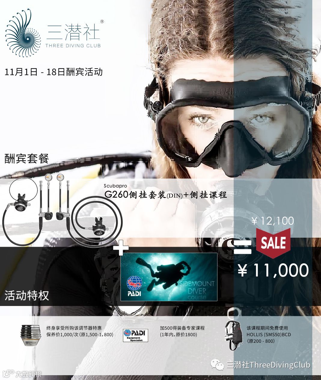 如果你的OW学的不错,而且觉得侧挂很帅,推荐你现在就入手这套调节器,三潜社三周年,购入此套装+侧挂课程,除套餐优惠外,更有终身保养优惠、课程优惠和侧挂BCD免费使用*,那么双11见。
