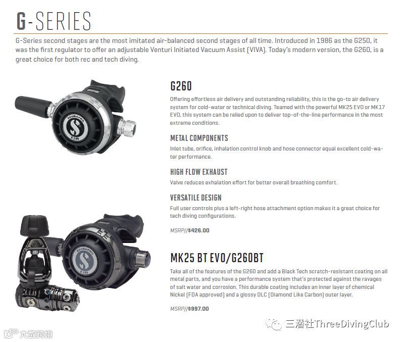 如同卡片机和单反机的区别,两者为了迎合了不同市场的而做出了专业性的研发,Scubapro的S系列和G系列也是如此,相比S系列主攻轻巧/漂亮/低阻抗的使用体验,G系列主要在环境适用性和大深度呼吸等技潜场合进行研发。