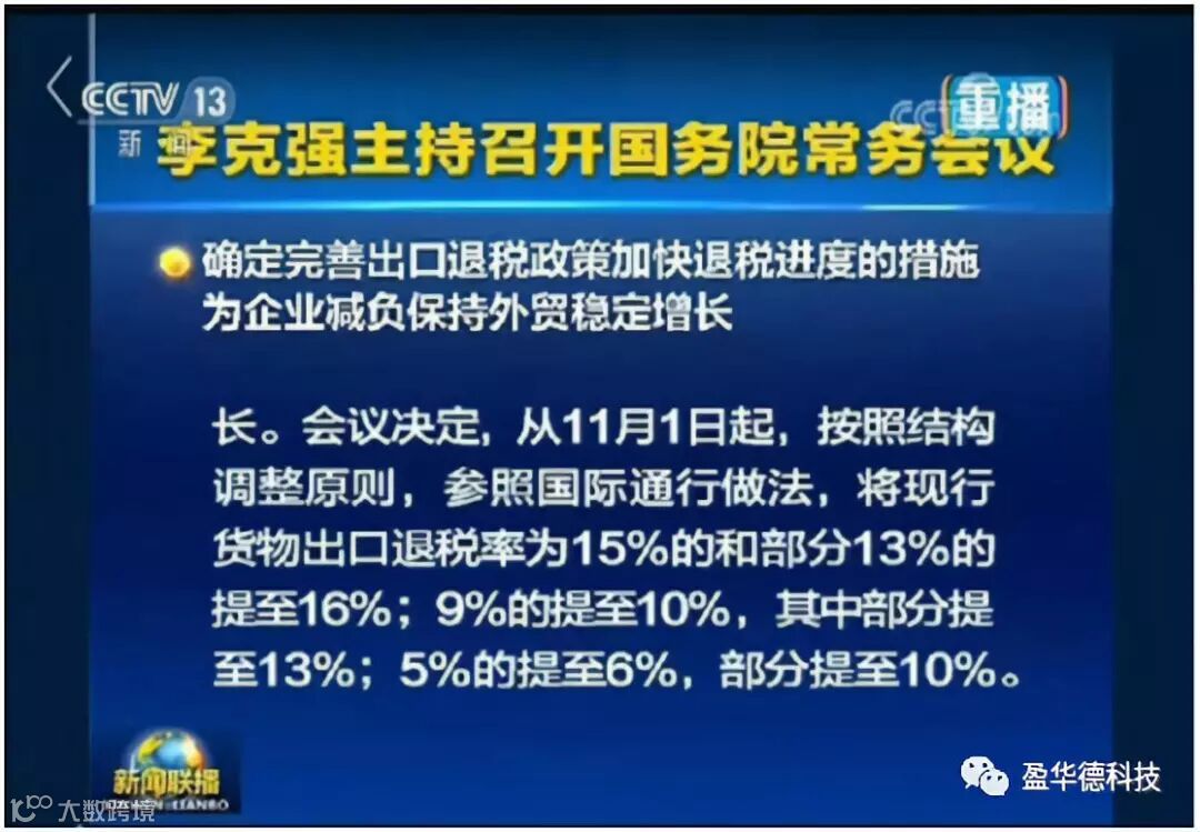 10月8日,国务院常务会议决定,从2018年11月1日起,按照结构调整原则,参照国际通行做法,将现行货物出口退税率为15%的和部分13%的提至16%;9%的提至10%,其中部分提至13%;5%的提至6%,部分提至10%。对高耗能、高污染、资源性产品和面临去产能任务等产品出口退税率维持不变。进一步简化税制,退税率由原来的七档减为五档。