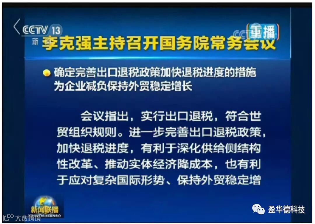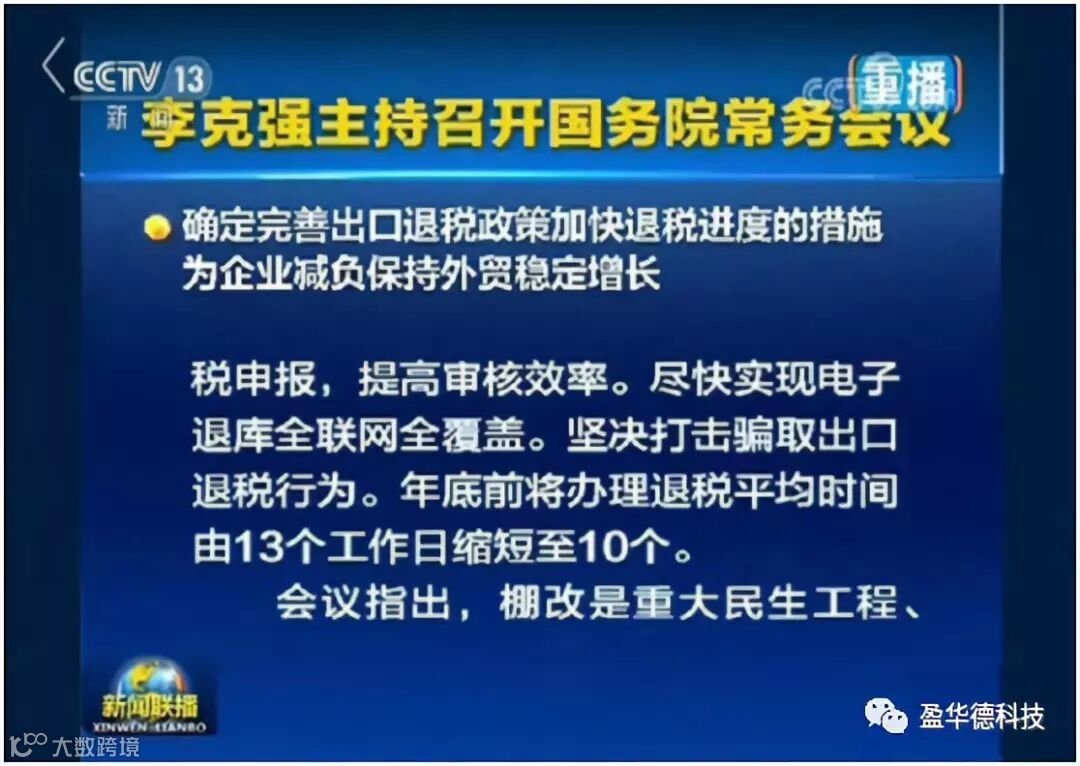 上述常务会议要求,为进一步加快退税进度,对信用评级高、纳税记录好的出口企业简化手续、缩短退税时间,全面推行无纸化退税申报,提高退税审核效率。优化退税服务,帮助企业及时收集单证申报退税,尽快实现电子退库全联网全覆盖。鼓励外贸综合服务企业为中小企业代办退税服务。今年底前将办理退税平均时间由目前的13个工作日缩短至10个工作日。