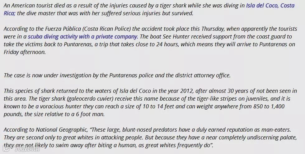 据报道,2017年11月30日,在Coco岛发生一起虎鲨袭击潜水员事件,遇难者系美国游客,陪同潜导亦手势严重,但为危机生命。当地警方称,事故发生在周四,SeeHunter船接到海岸警卫队协助通知,通过24小时候于周五下午将遇难者送抵Puntarenas。