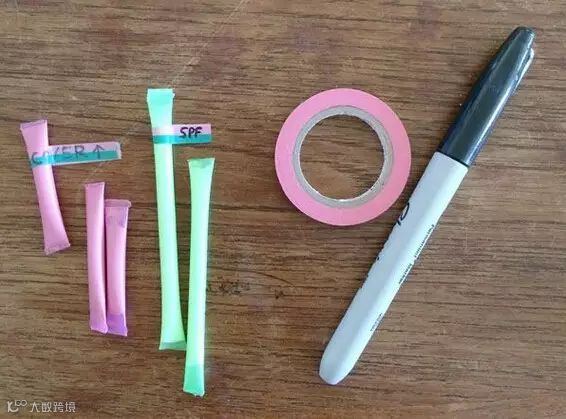 巧用吸管,让所有的乳液、护肤品、洗面奶量化到吸管里。最后不要忘记用彩色贴纸标注清楚里面装的是什么。