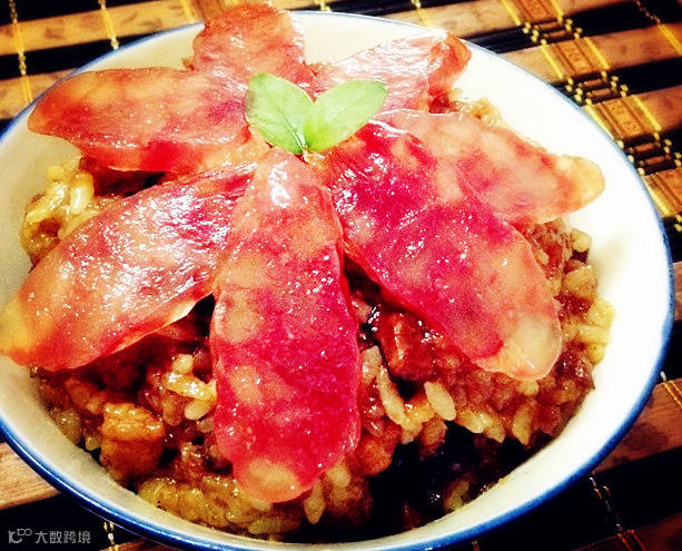 5.煮米饭的时候可以煮些香肠,放在饭上,装碗就开吃吧