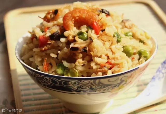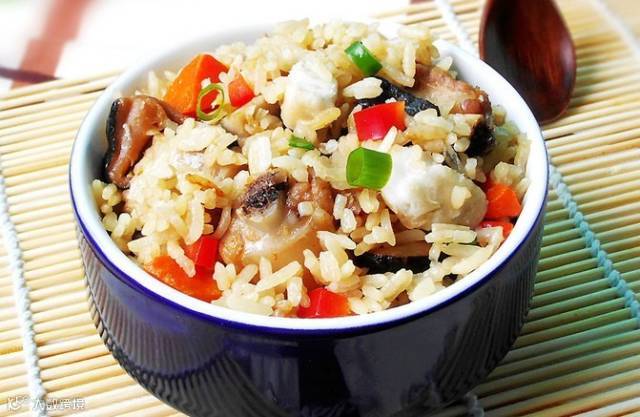 9.米淘洗干净~将炒好的食材倒入锅里,放入几朵洗干净的干香菇(不用泡发) 比平时煮饭多一点水,跳闸后继续多焖一会儿,尽量焖干一点,喜欢锅巴的可以多煮一会儿出锅巴。