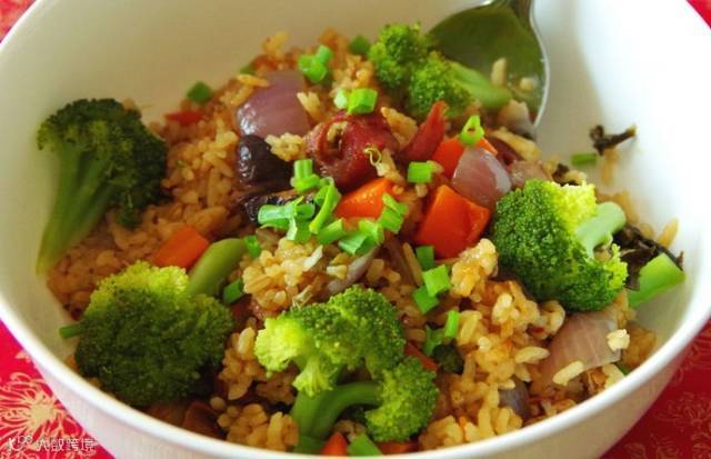 5.按煮饭键,正常煮饭,当电饭煲提示还有10分钟煮熟的时候加入西兰花,撒点枸杞什么的,直到煮熟,再焖一会就可以啦。香喷喷滴焖饭就好啦!
