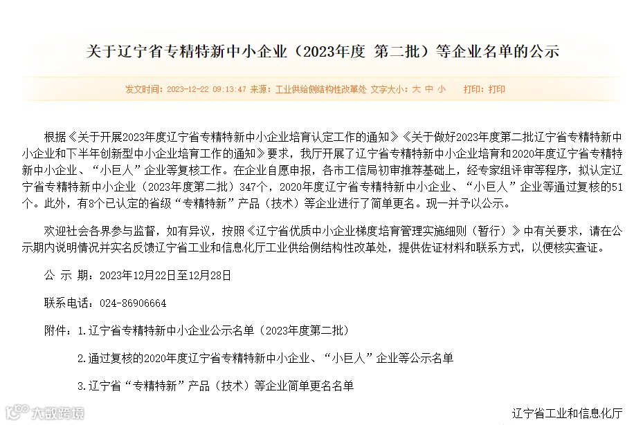 辽宁省专精特新中小企业(2023年度第二批)于2023年12月28日通过公示,大连天正实业有限公司通过专家组评审等程序,荣获辽宁省“专精特新”中小企业称号及奖励。