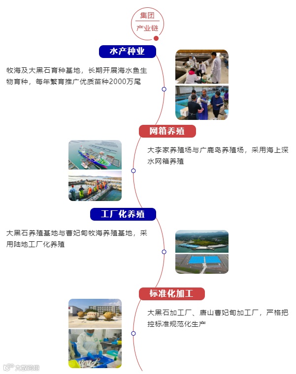 企业下辖4个养殖场、2个加工厂以及进出口贸易、国内销售和餐饮等公司,年总营业收入在2亿元以上。每年繁育红鳍东方鲀、鲆鲽类、黑鮶等名贵海水鱼种苗量千万尾以上,养殖产量2000余吨。