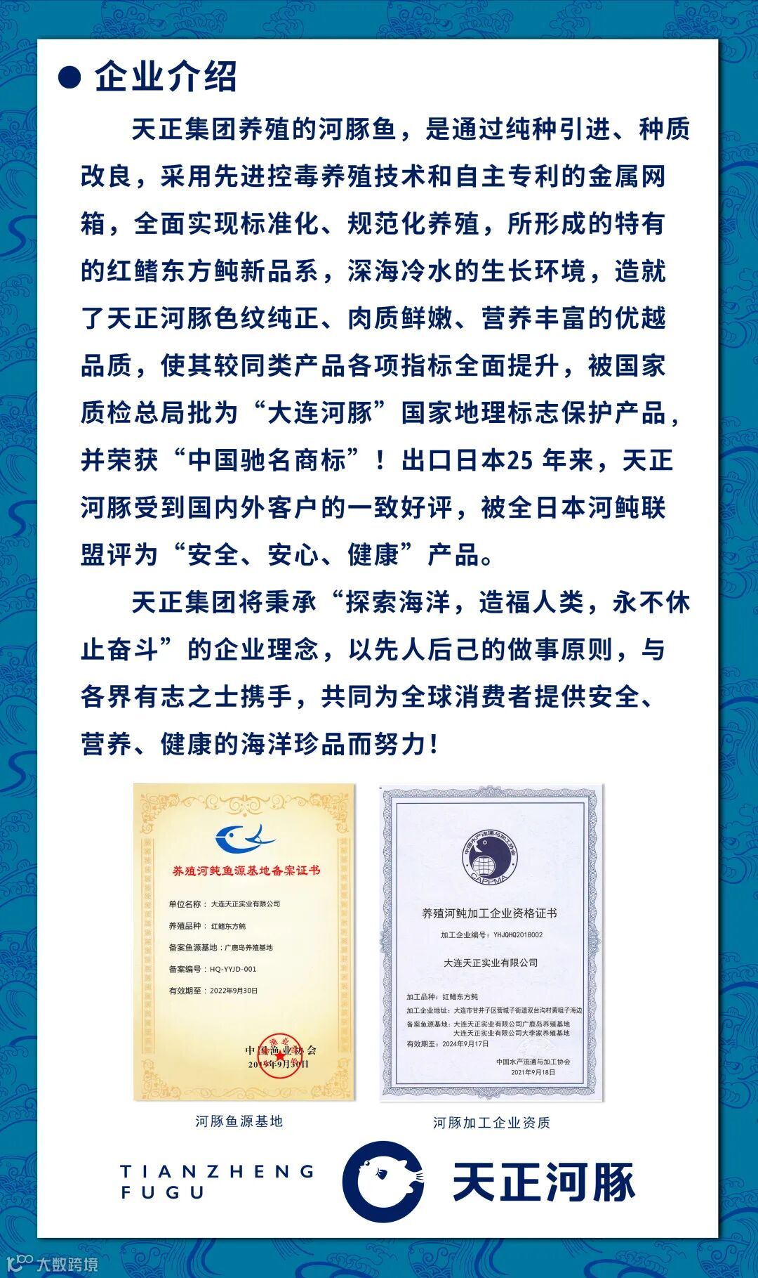 唐山牧海水产养殖有限公司成立于2018年,是天正集团通过曹妃甸区招商引资注册成立的全资子公司,占农业设施用地130亩,主营红鳍东方鲀、菊黄东方鲀、褐牙鲆、大菱鲆、半滑舌鳎、圆斑星鲽等海水鱼苗种繁育和养殖等业务,建有工厂化养殖车间20000余平方米、育种车间5000余平方米,是河北省河鲀良种场和唐山市水产健康养殖示范场。