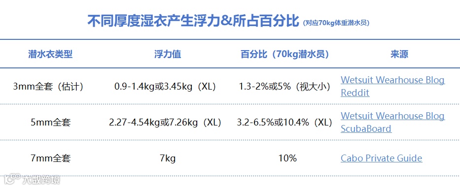 ✅ 参考:3mm湿衣约占体重的5%;新湿衣比旧湿衣更“浮”。