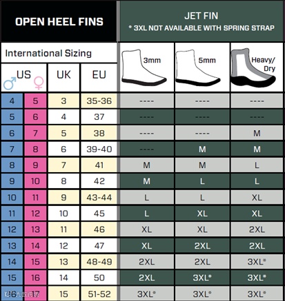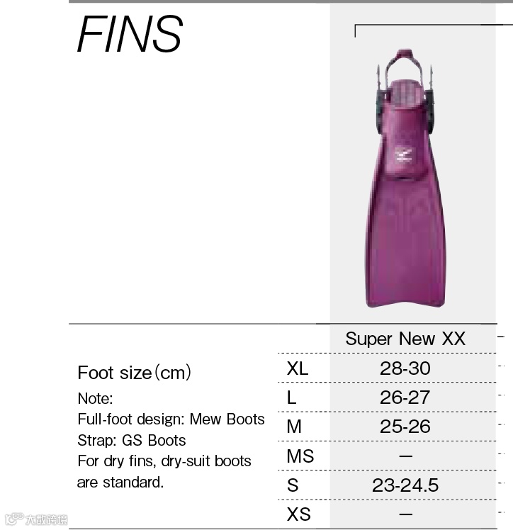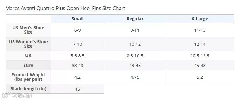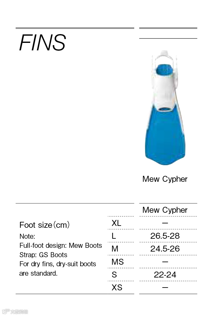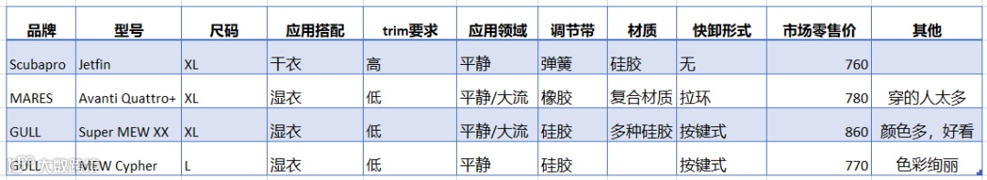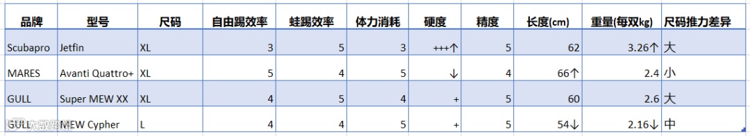 表格了解下,我这里都是以XL来比较的,因为XX和Jetfin的脚蹼对尺码的差异比较敏感,Cypher最大只有L码