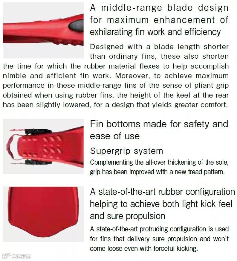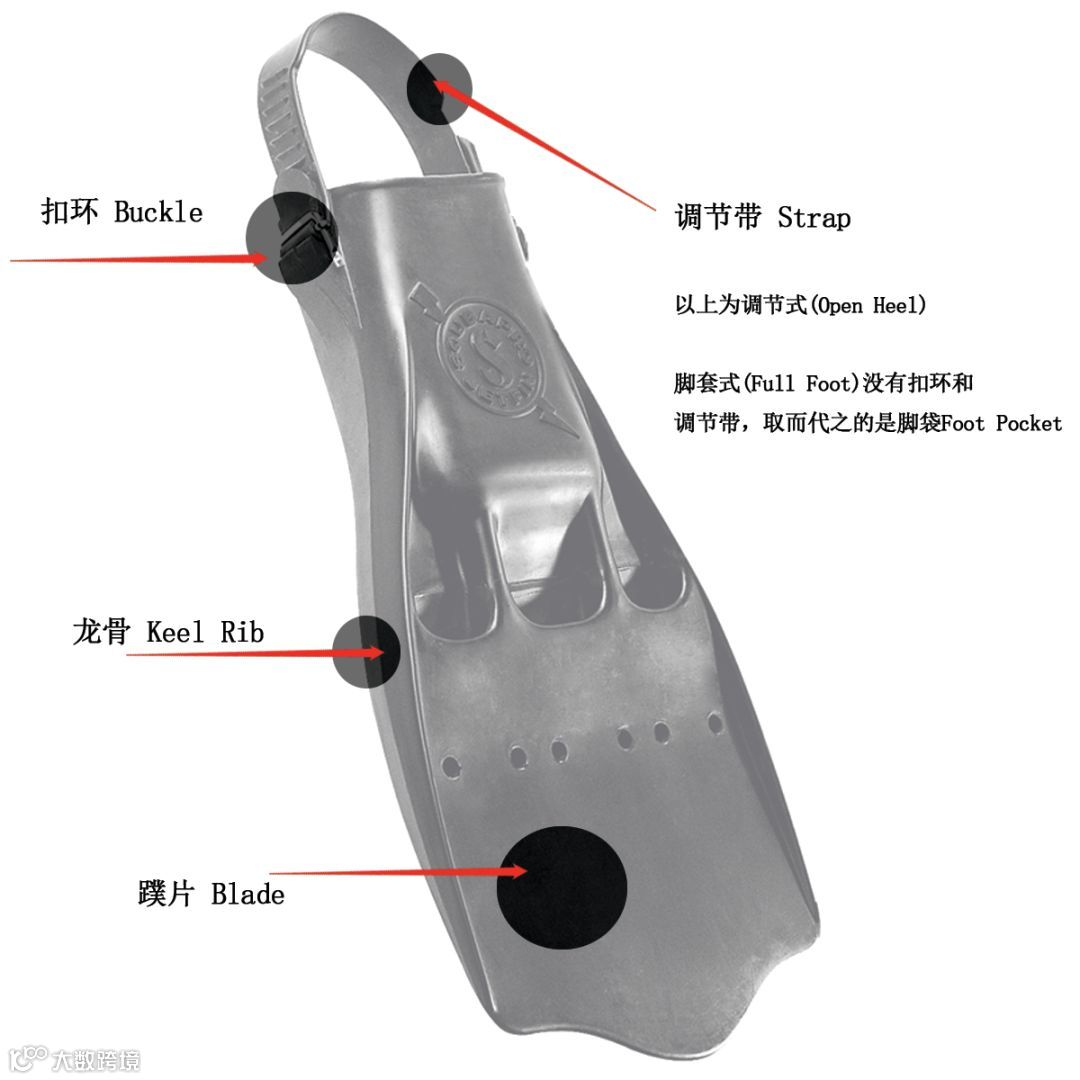 四款脚蹼都是调节式,都要配合潜水鞋穿脱,但扣紧方式略有不同,下面会讲到,这里的给出图示,方便有问题的时候可以和当地潜店沟通。