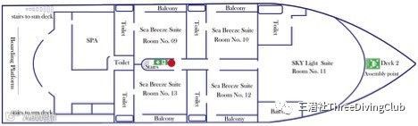 仅一间超豪华星空套房(60㎡)前景天窗为超大视野的单向透视玻璃,位于上甲板前端