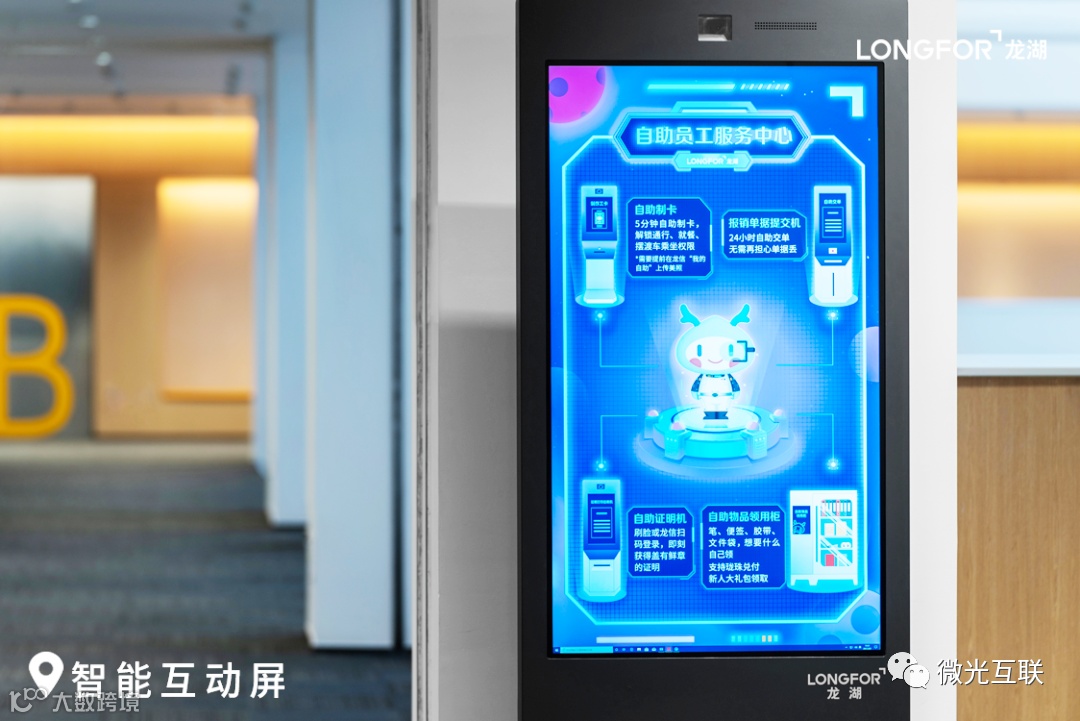 35台智能互动屏分散布置在智慧总部的主要空间节点,不仅可以便捷查找办公区、卫生间、母婴室、会议室等,还能一键预定会议室、一键呼叫远程人工服务,并可以通过人脸识别自动提醒当日日程及会议。