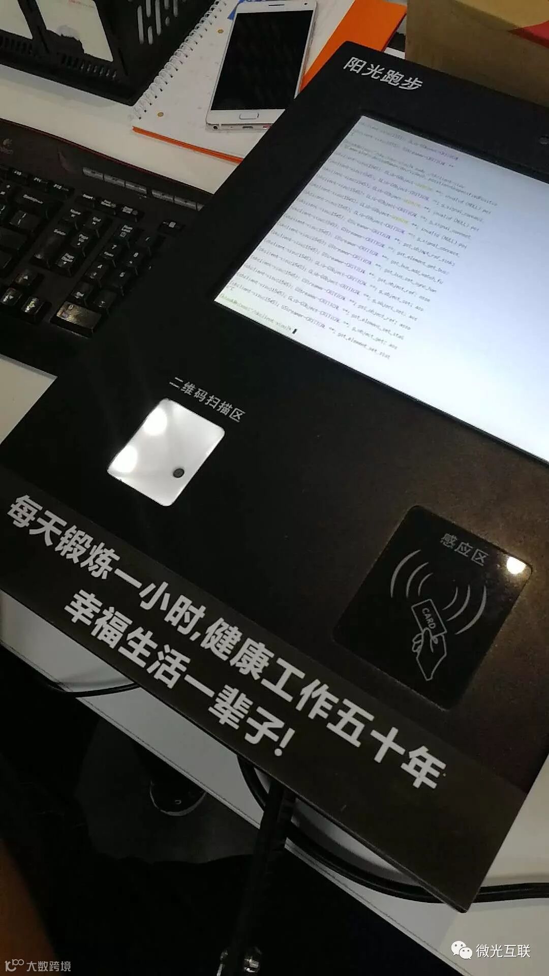 这就是一款阳光跑步打卡机。上面的二维码扫描区就是微光互联的产品,型号是QT660。宽61mm,高65mm,厚度仅3.5mm,体积虽小,但丝毫不会影响到它的识读速度和精度,而且同样支持多种输出方式和多种开发接口,安装便捷,可以用在很多款自助设备上。