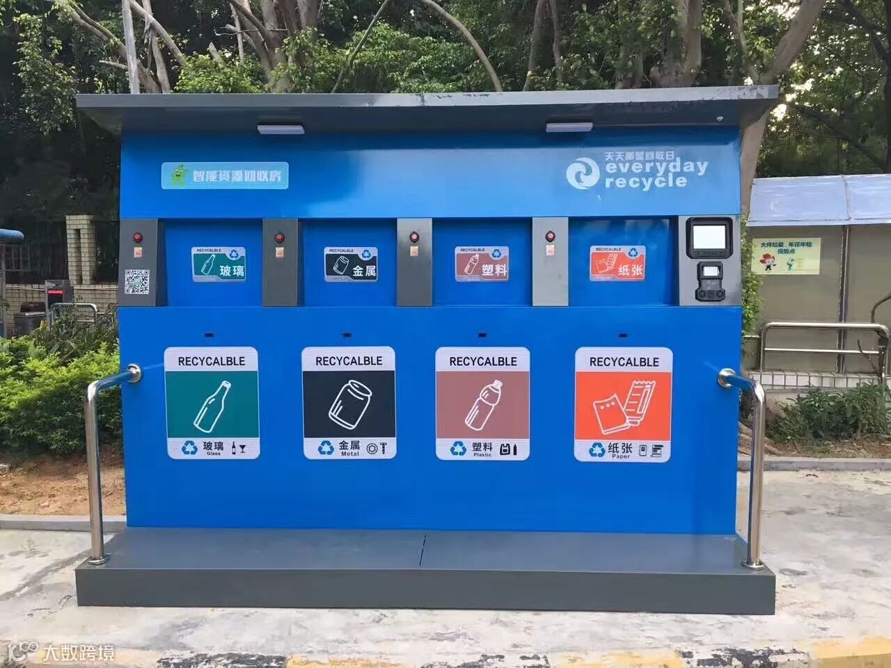 这款回收房高约2米,宽有3米多,上面有遮雨棚,设有四个“窗口”,分别用于回收玻璃、金属、塑料、纸张等可回收废品。据介绍,把分类好的可回收废品放进智能资源回收房,回收房会自动称重、核算价格,换来的钱会自动存储到手机APP的账户内,可用于提现、兑换饮料等。