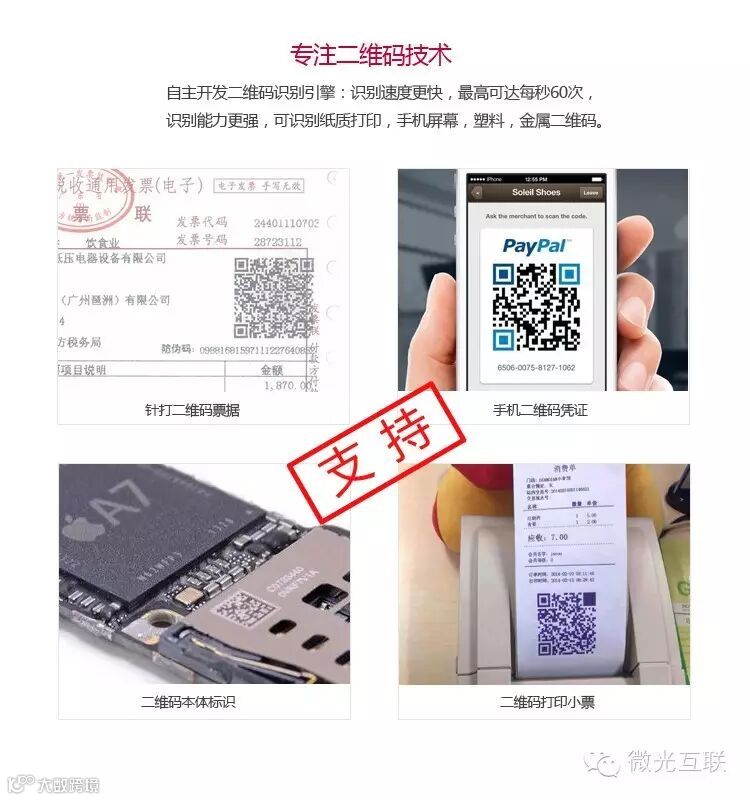 产品提供USB和RS232两种接口,其中USB接口以模拟键盘方式输出信息,RS232以标准串口协议输出信息。产品操作简单方便,支持手机二维码,纸质二维码,金属二维码等各种介质上的二维码,同时与支付宝二维码、微信二维码等各种主流二维码系统兼容,产品适用范围广。