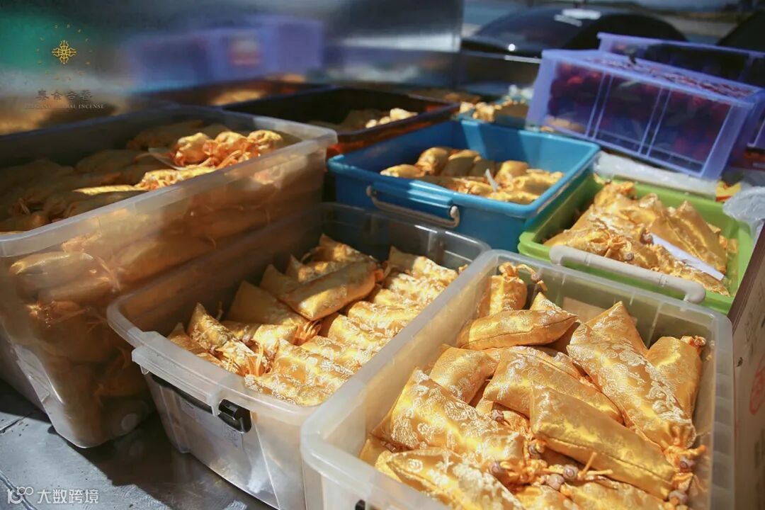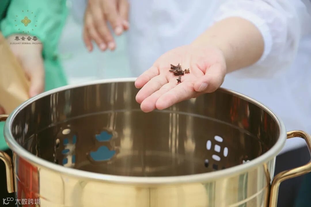 供养的每一宝袋中,除了泰余独有的特别调和的慈妙香粉,同时加入龙王坛城、各类宝石、以及丁香等等。