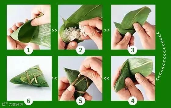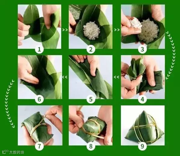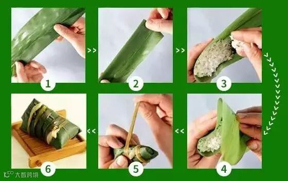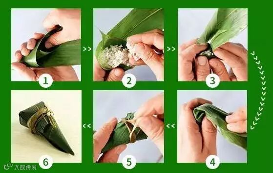 3、上部的粽叶向下折,直到完全盖住开口为止。