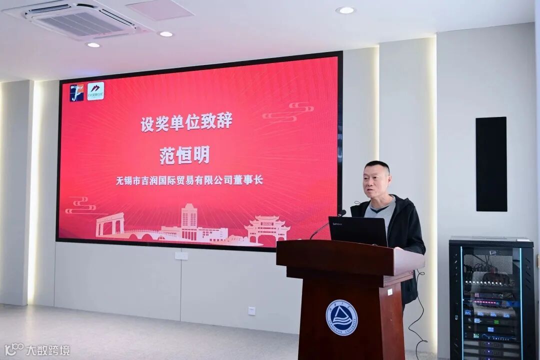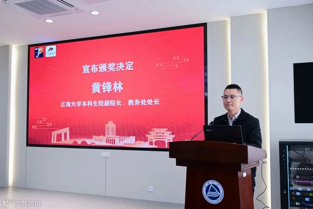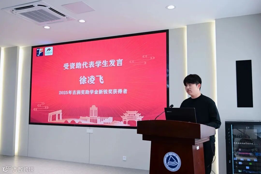 黄锋林宣读表彰决定。共同为获奖同学和团队颁发证书。2025年新锐奖获得者徐凌飞作为获奖学生代表发言,他首先感谢吉润国际的爱心捐赠,他表示,“吉润奖助学金”对他而言,是一份厚重的认可,更是一股持续前行的精神动力。他将始终怀揣感恩之心,脚踏实地、勇于探索,努力在专业领域有所建树。