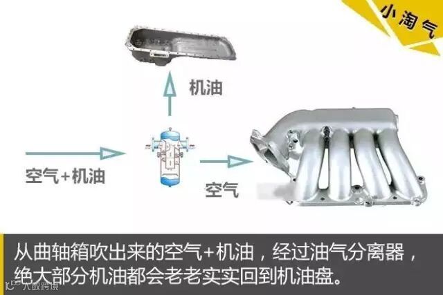 看名字大家就知道,油气分离器是用来把空气和机油分开的,经过这么一道“工序”,大部分机油就分离出来老老实实回到机油盘了,可是还有那么一小撮“敌对分子”,太淘气!它们还是随着空气跑到进气歧管里啦!