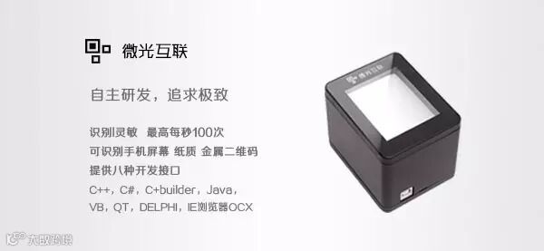 系统中所使用的扫码器,是微光互联自主研发的一款软解码设备,铝合金整体设计,外观高端大气。提供八种开发接口,可以更方便的进行二次开发,目前广泛应用于微信二维码支付、支付宝二维码支付、自助售货系统、电子票务、终端门店管理等领域。