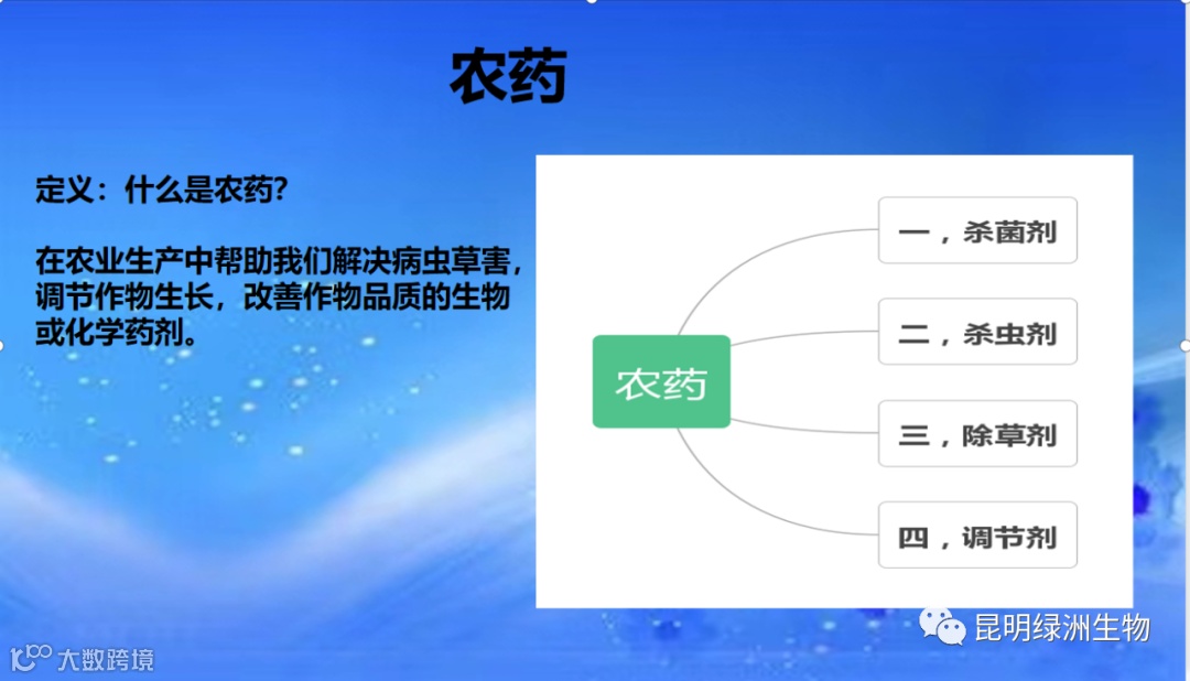 第一天讲解了农药的概念,农药分为杀菌剂,杀虫剂,除草剂,调节剂四种类。