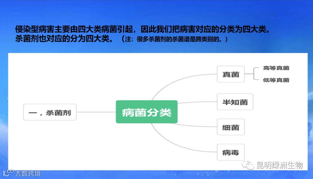 杀菌剂分为真菌(高等真菌,低等真菌),半知菌(灰霉病---啶酰菌胺),细菌(特点:单细胞,比较小),病毒。