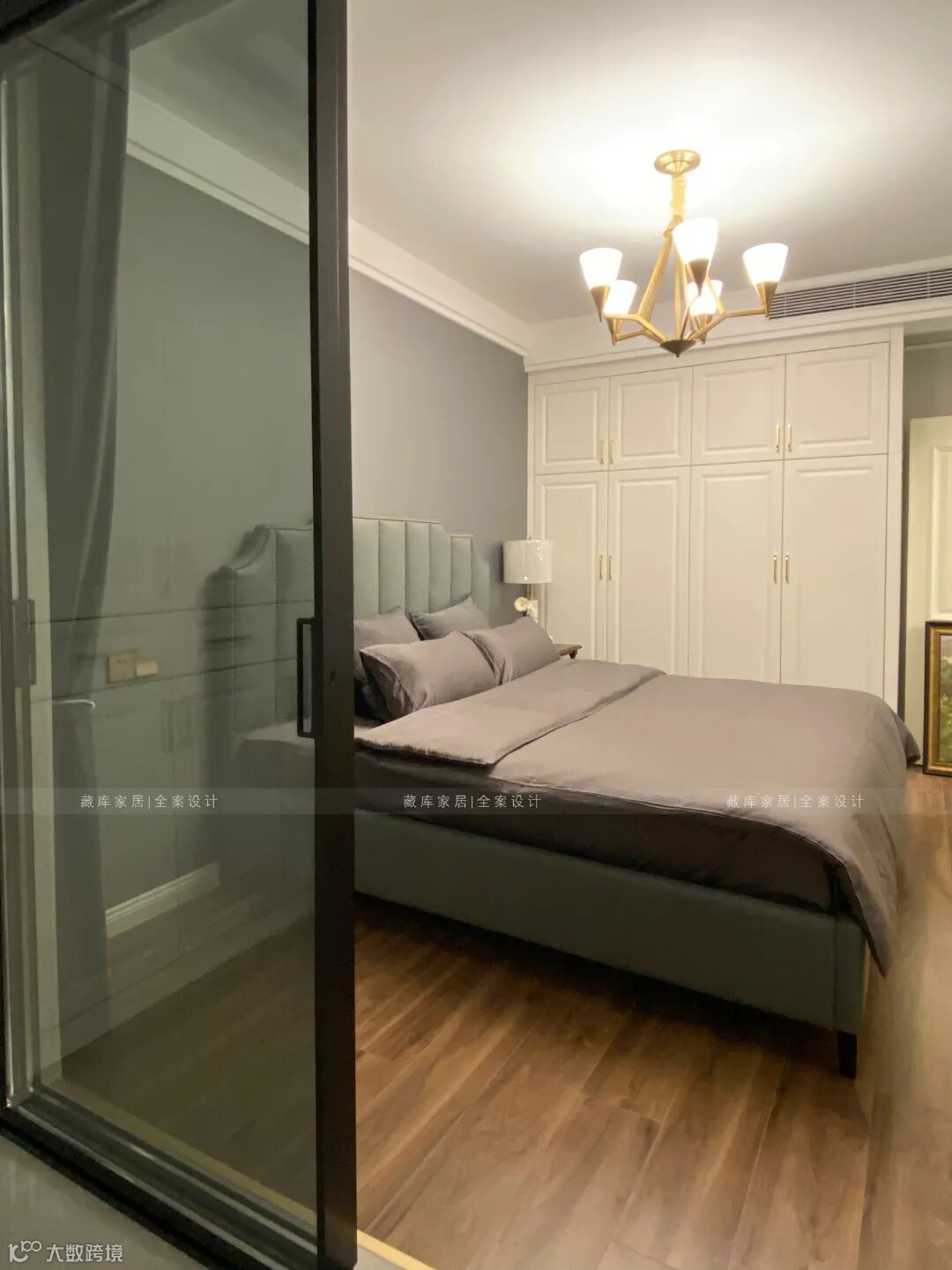线条丰富的床头设计尽显低调优雅,点缀的金属铆钉元素和吊灯呼应,年轻随性又不失精致高级。