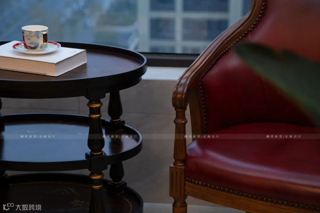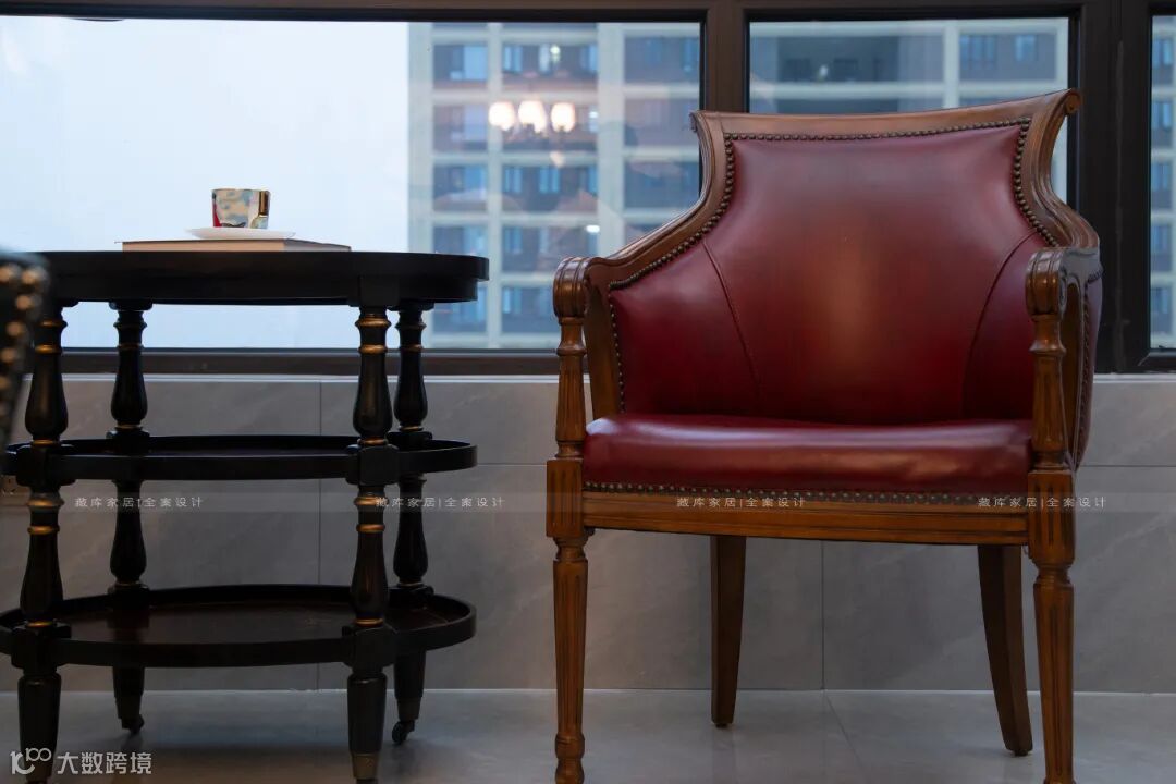 奢华暗纹墙面,栗褐色和勃艮第红的碰撞交融,浓郁的电影感配色极富故事感,铆钉走边和实木材质将美式的随性和复古完全迸发。