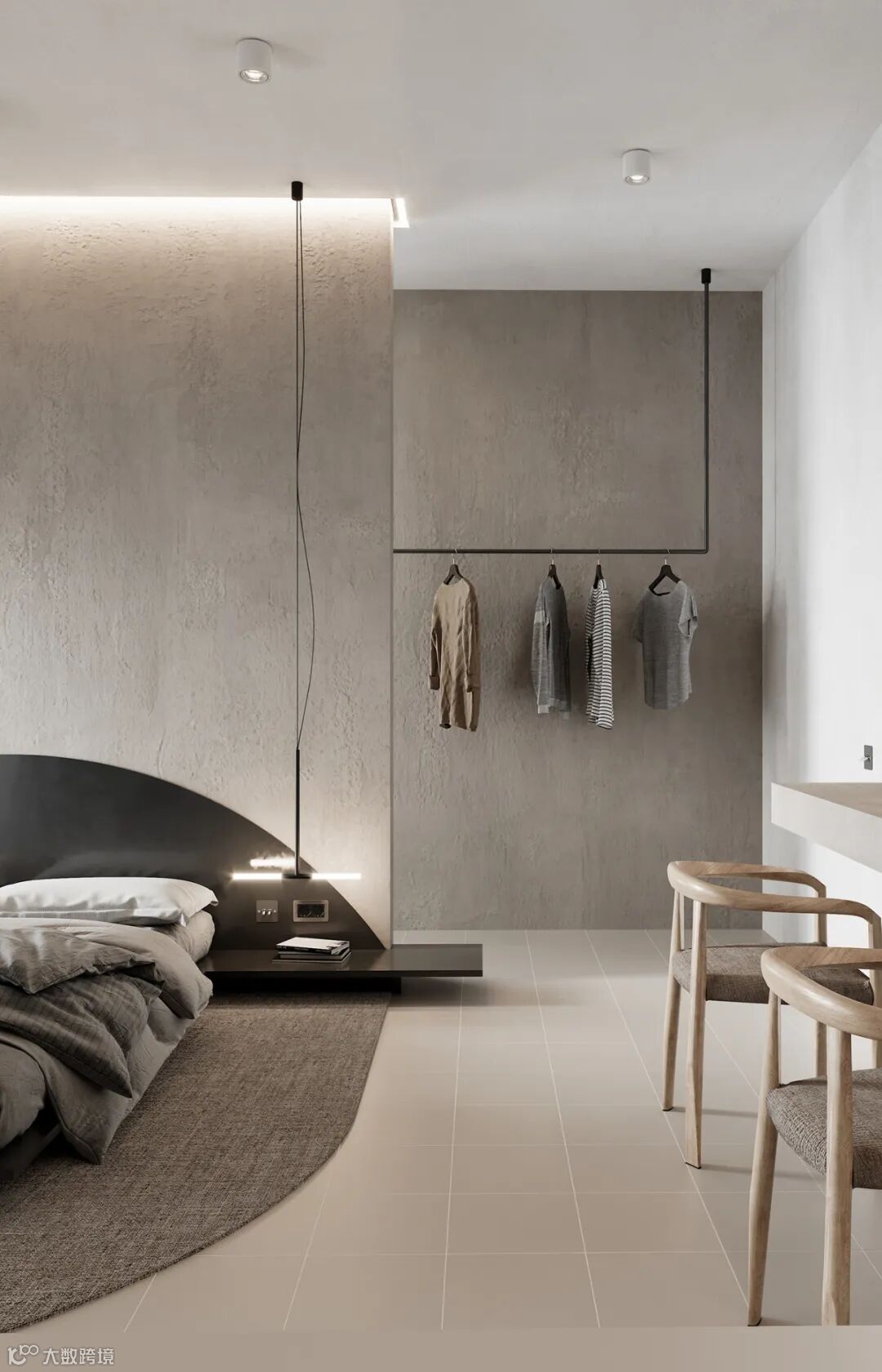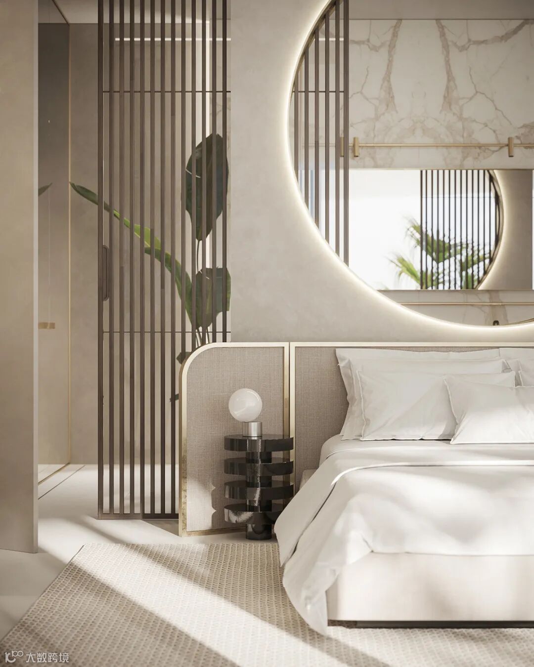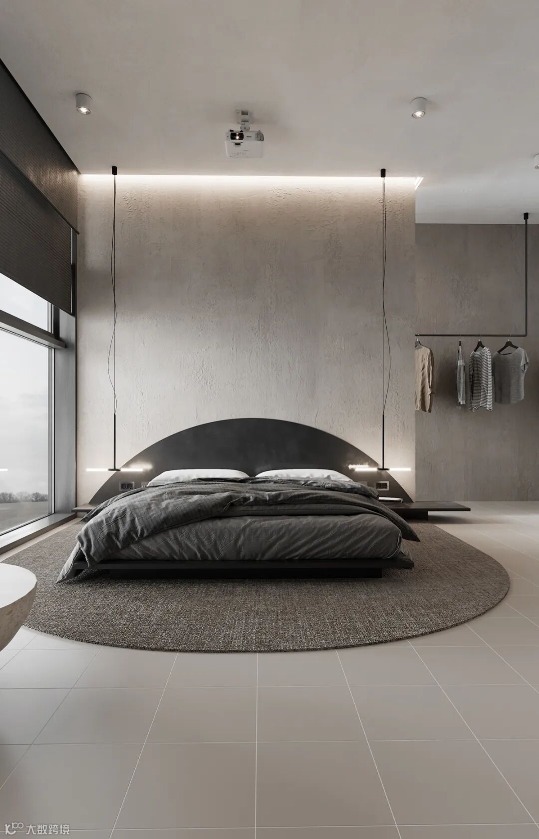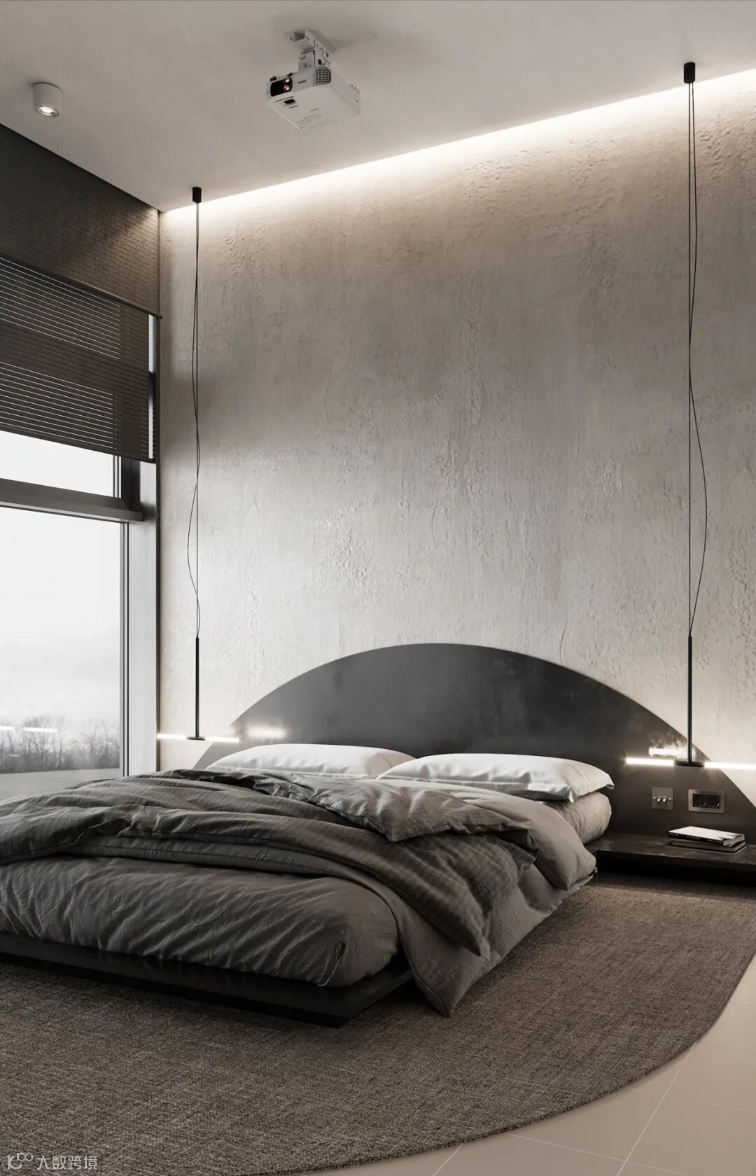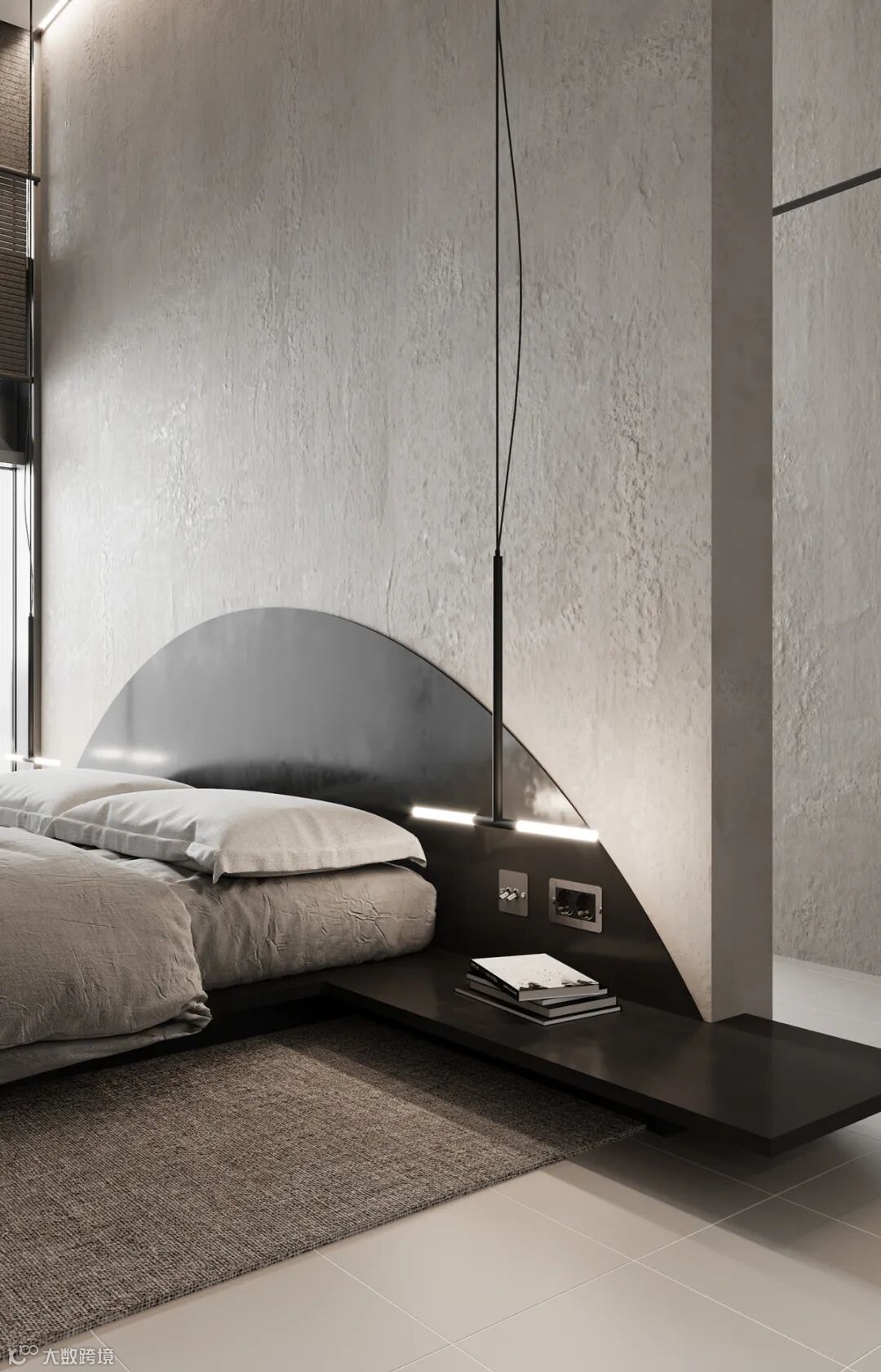 现代简约的主卧室,舒适温暖,一个让人可以放松和享受的地方。光线以柔和、温馨、富于变化为原则,诠释着业主对美的品味追求与超凡脱俗的气质。
