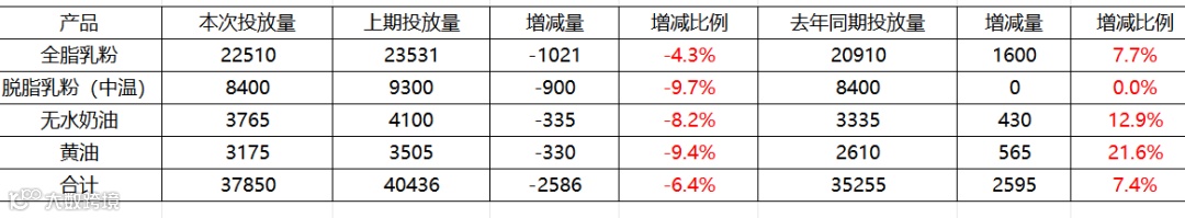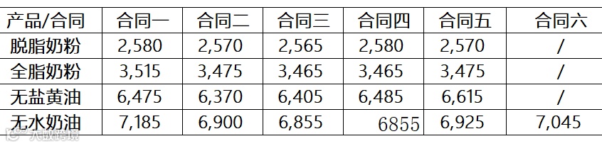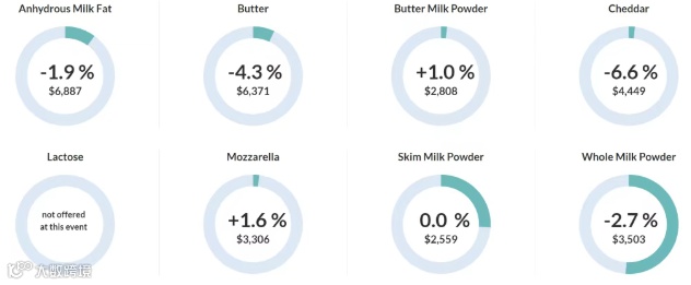 脱脂乳粉价格持平,均价2,559美元/公吨;全脂乳粉价格下跌2.7%,均价3,503美元/公吨;黄油价格下跌4.3%,均价6,371美元/公吨;无水奶油下跌1.9%,均价6,887美元/公吨。具体拍卖结果如下: