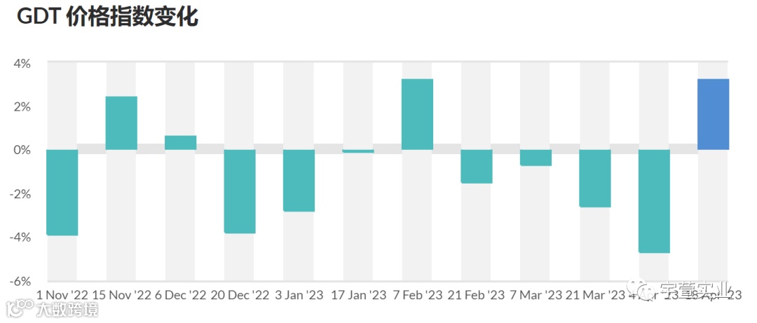 GDT价格指数在经历连续4期下调后,本期止跌见涨。本次GDT各主要品种价格均有不同幅度的上涨,预计带动市场成交。