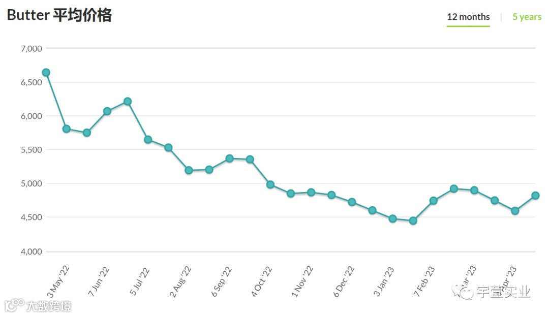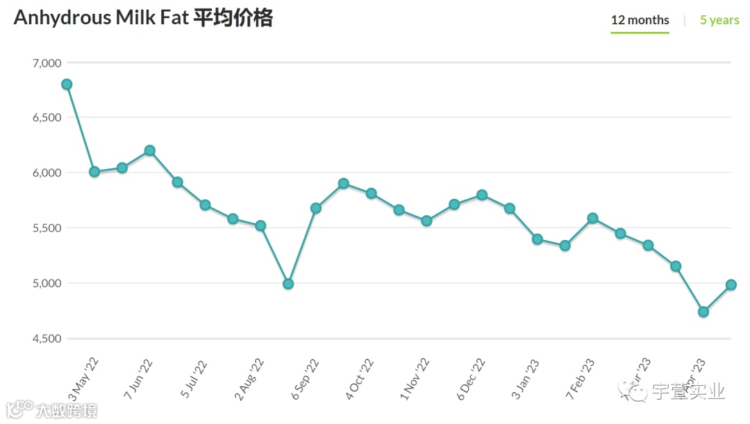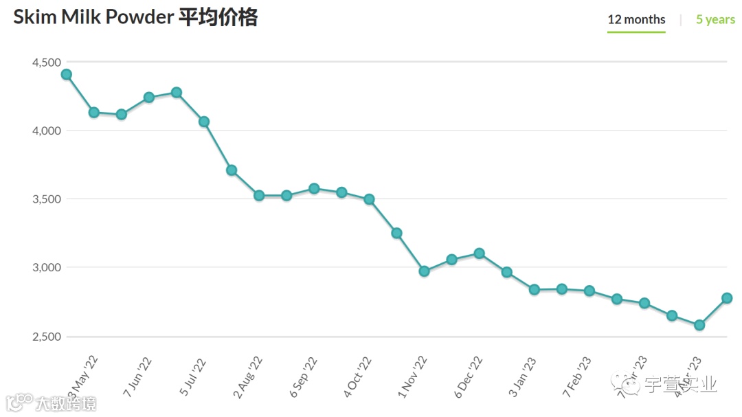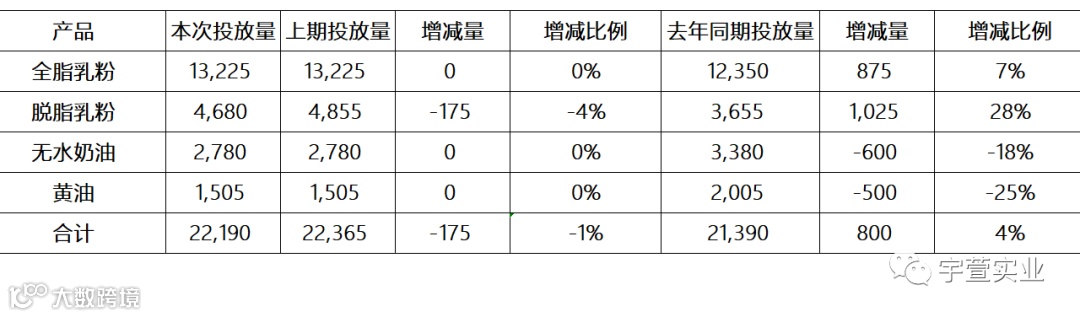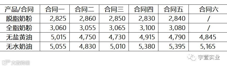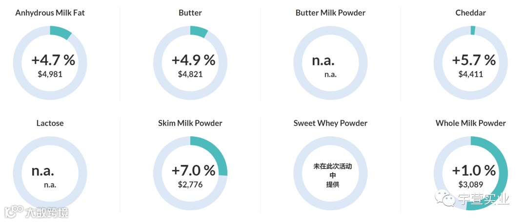 本次拍卖脱脂乳粉价格上涨7.0%,均价2,776美元/公吨;全脂乳粉上涨1.0%,均价3,089美元/公吨;黄油上涨4.9%,均价4,821美元/公吨;无水奶油上涨4.7%,均价4,981美元/公吨,具体拍卖结果如下: