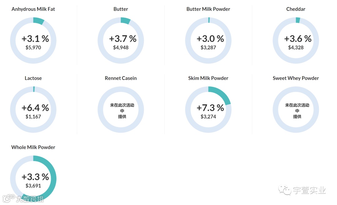 9月7日GDT第291次拍卖各产品不同幅度反弹,本次拍卖价格指数上涨4.0%,平均中标价3,927美元/公吨。其中全脂乳粉上涨3.3%,脱脂乳粉上涨7.3%,黄油上涨3.7%,无水油上涨3.1%,具体结果如下: