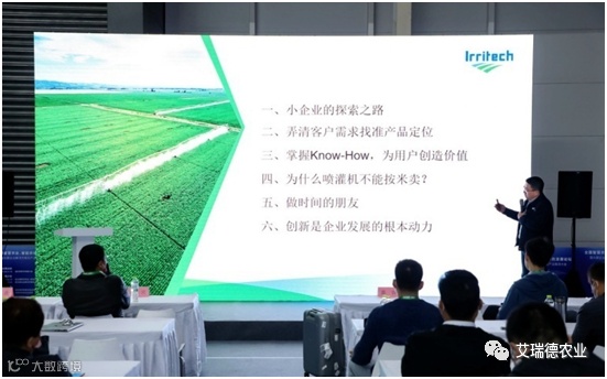 在中国农业机械流通协会灌排分会举办的高标准农田建设及高效节水灌溉自动化应用论坛上,公司董事长马总做了题目为《平移式喷灌机在国内的探索和发展》的报告,马总以生动朴实的语言,将最近多年的研发创新、市场推广等方面积累的经验和遇到的困难跟前来的观众和行业同仁进行了分享。