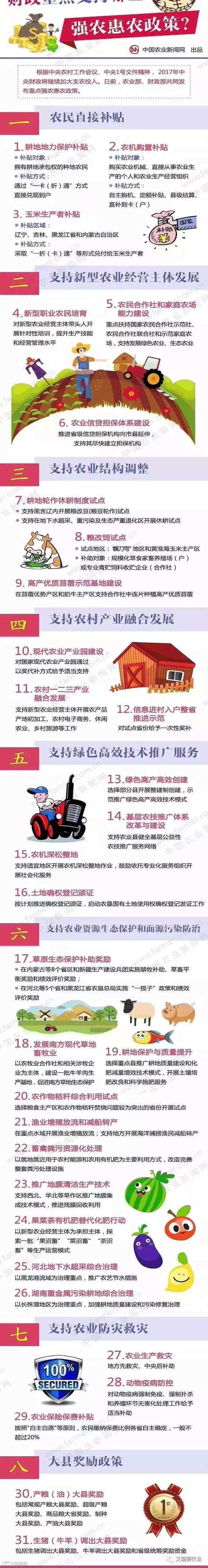 落实中央农村工作会议、中央1号文件精神,紧紧围绕农业供给侧结构性改革,2017年中央财政继续加大支农投入,强化项目统筹整合。现将农业部、财政部共同实施的重点强农惠农政策发布如下。