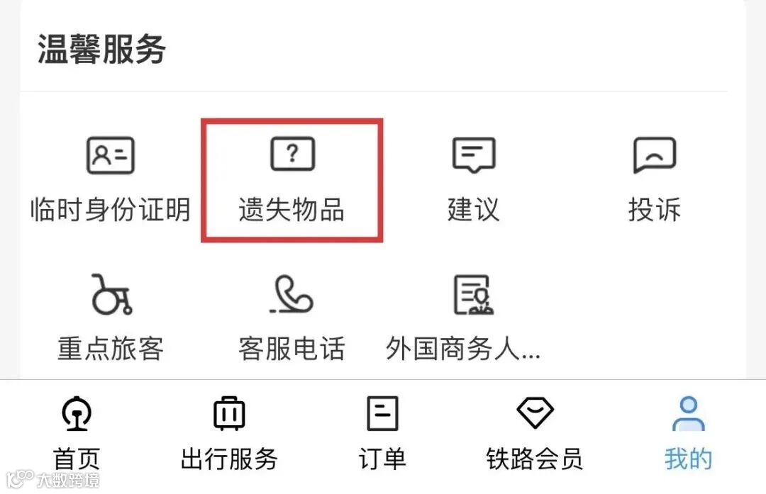 打开铁路12306App首页,找到右下角【我的】,点击“温馨服务”中的“遗失物品”,按要求填写相关信息。