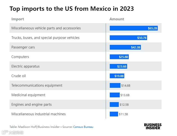 这一年,美国从墨西哥进口了价值超过650亿美元的汽车零部件,以及约260亿美元的计算机设备、近200亿美元的原油和近140亿美元的医疗设备。