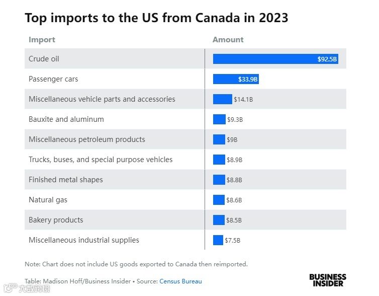 具体而言,2023年,美国从加拿大进口最多的包括价值超过920亿美元的原油,约340亿美元的乘用车和近90亿美元的天然气。