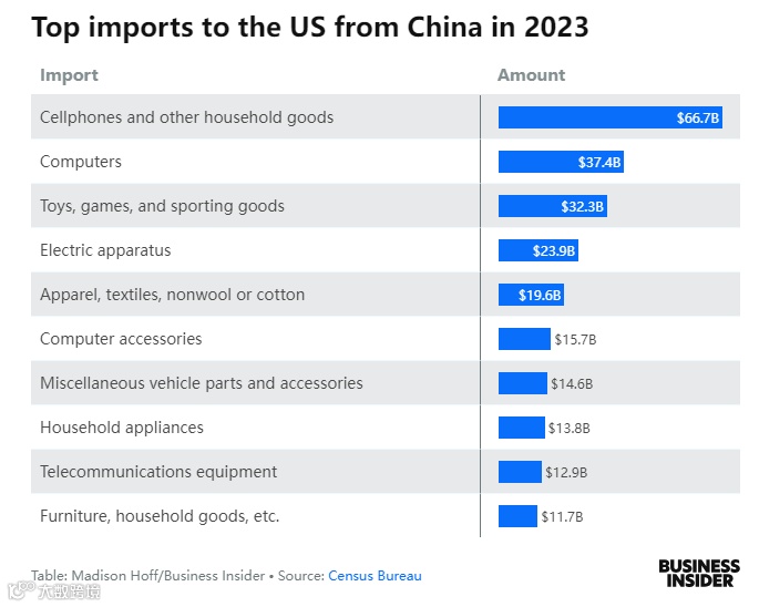 与此同时,中国是美国电子产品的主要供应国。数据显示,2023年,美国从中国进口了近670亿美元的手机和其他家居用品,超过370亿美元的计算机设备,超过320亿美元的游戏、玩具和体育用品。