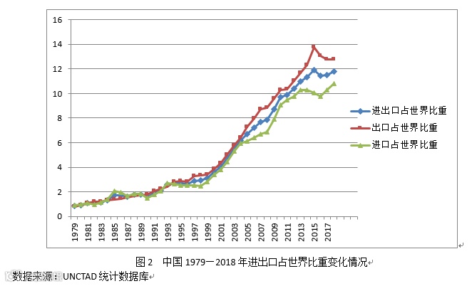 从1979-2018年,中国进出口总额从293.4亿美元提高到46230.4亿美元,年均增长约14%,在全球货物贸易中的排名由第30位跃升至第1位。详情看图2。