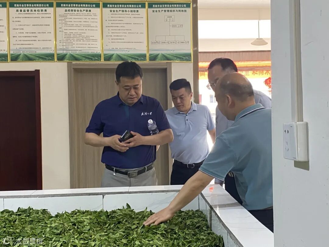 4月18日上午,武汉大学总务后勤保障部部长周军一行深入金苔香茶业生产基地详细了解春茶生产情况。恩施市人民政府副市长谢献谋等人陪同参与。