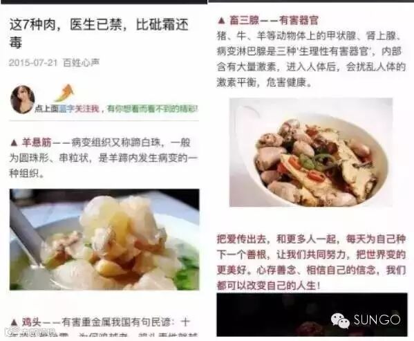 概要:文章有一个耸人听闻的题目,将食物与砒霜做比较,让人有食用就会致死的联想。文中例举了羊悬筋、鸡头、猪脖子里的肉疙瘩、禽尖翅、鸡脖鸭脖、鱼腹腔里的“黑衣”、畜三腺这七种肉类,称这些部位的肉抑或为病变组织、抑或有腺体、抑或含有重金属,不能食用。