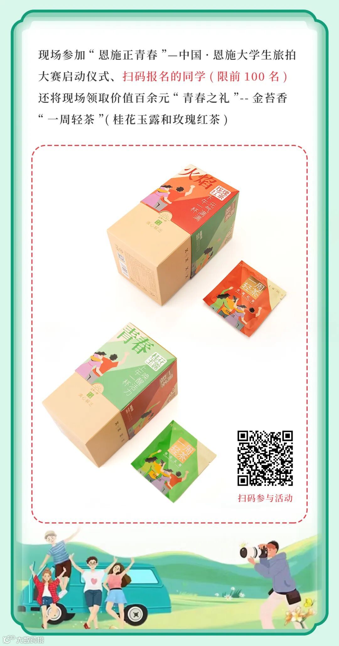 与此同时,现场参加“恩施正青春”大赛启动仪式,并且扫码报名的同学(前100名),价值百元的“青春之礼”一周轻茶免费领取。
