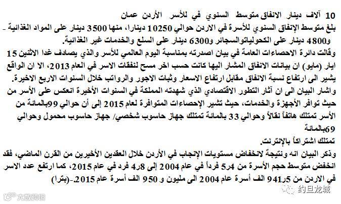据《约旦时报》报道,约旦统计局(DoS)5月15日发表的声明称,约旦的家庭平均每年消费额约为10250约第,其中包括3500约第的食品,450约第的烟等副食品和6300约第的非食品类商品和服务。