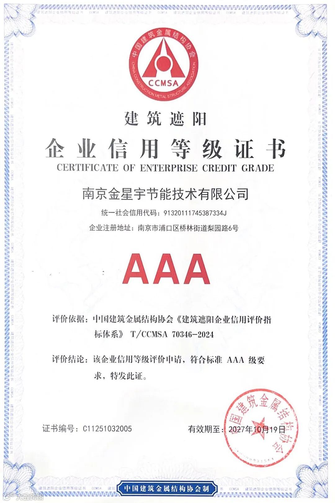 近日,南京金星宇节能技术有限公司(以下简称“金星宇遮阳”)在中国建筑金属结构协会组织的企业信用等级评价中,凭借稳健的经营表现、完善的管理体系和强劲的品牌实力,荣获“建筑遮阳企业信用等级AAA级”荣誉。这一评价是最高等级,充分体现了金星宇遮阳在建筑遮阳领域的综合实力与行业影响力。