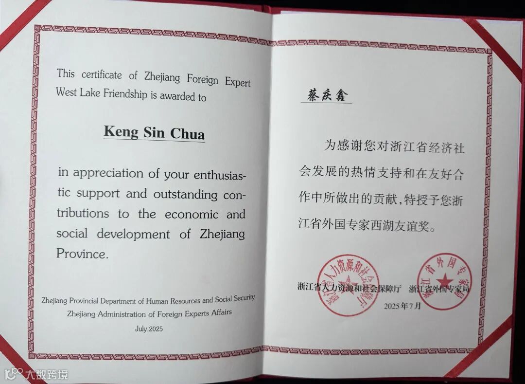 我们自豪地宣布,浙江庆鑫科技有限公司创始人兼CEO蔡庆鑫先生(马来西亚籍)荣获浙江省政府颁发的 “西湖友谊奖” ——这一外籍专家的最高荣誉!这份殊荣旨在表彰在经济社会发展、国际交流合作中作出突出贡献的外籍人士,它是浙江省政府授予蔡庆鑫先生个人贡献的肯定!
